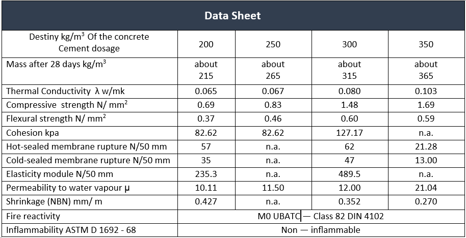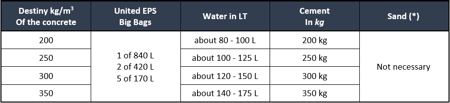 Dosages to obtain lm3 of lightweight thermal insulating concrete:
